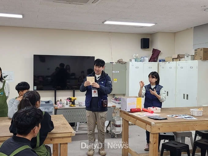 캠프 주요 내용은 ▲ 산불피해목을 활용한 탄소중립 목공 체험 ▲ 숲 속 자연물을 활용한 숲놀이 등으로 구성됐으며, 청각장애 학생을 위해 숲체원 직원이 직접 수어를 통해 프로그램을 운영할 예정이다.