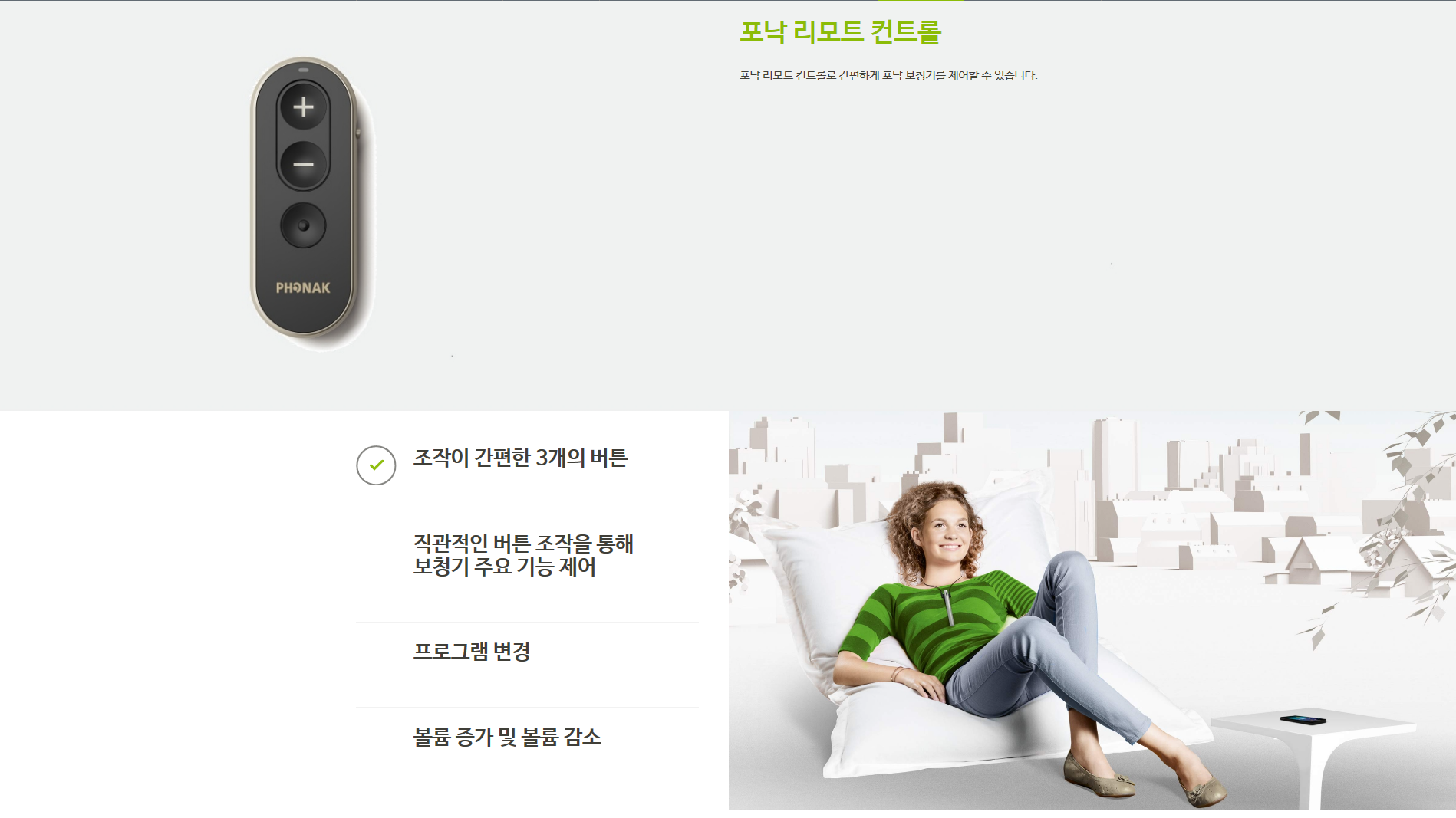 보청기의 볼륨과 프로그램을 편리하게 조절하는 리모컨